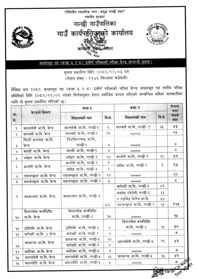 आधारभूत तह (कक्षा ५ र ८) उत्तीर्ण परीक्षाको परीक्षा केन्द्र सम्बन्धी सूचना ।