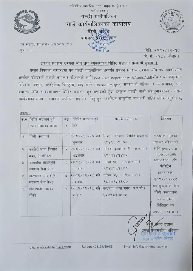 प्रजनन् स्वास्थ्य रुग्णता जाँच तथा व्यवस्थापन शिविर सञ्चालन सम्बन्धी सुचना ।