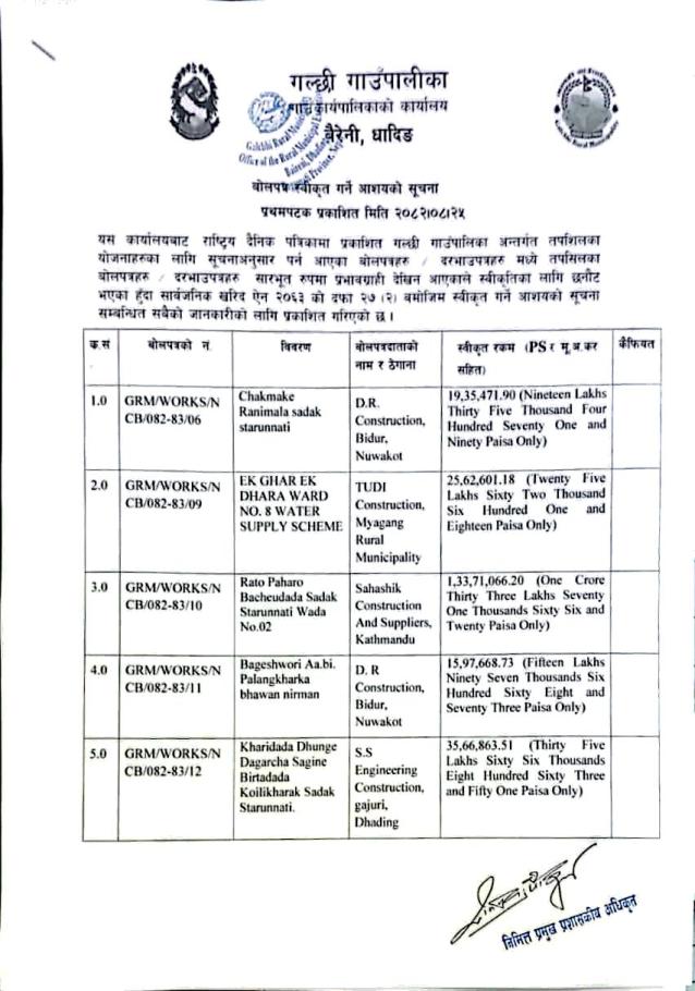बोलपत्र स्वीकृत गर्ने आशयको सूचना !
