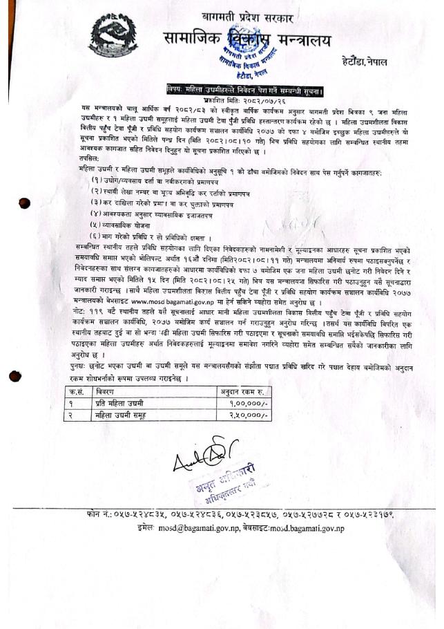 महिला उद्यमीहरुले निवेदन पेश गर्ने सम्बन्धी सूचना !!