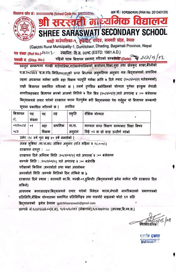 शिक्षक आवश्यकता सम्बन्धी सूचना।