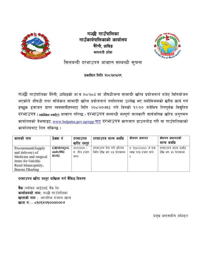 सिलबन्दी दरभाउपत्र आह्वानको सूचना ।