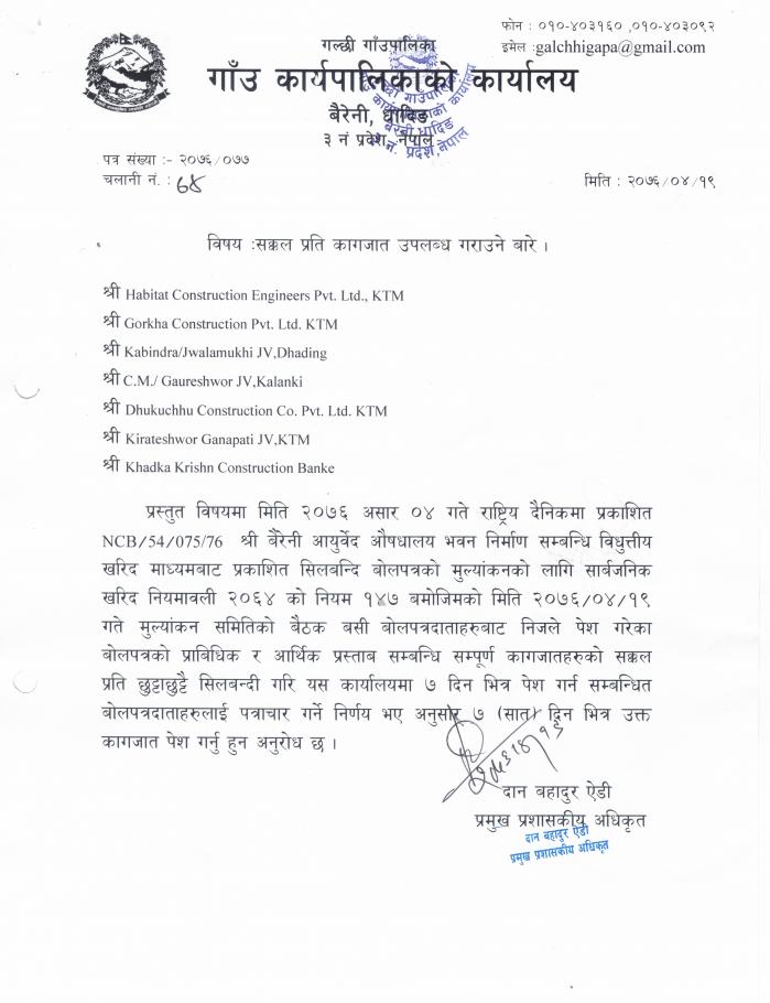 सक्कल प्रति कागजात उपलब्ध गराउने बारे सूचना (श्री बैरेनीआयुर्वेद औषधालय भवन निर्माण)