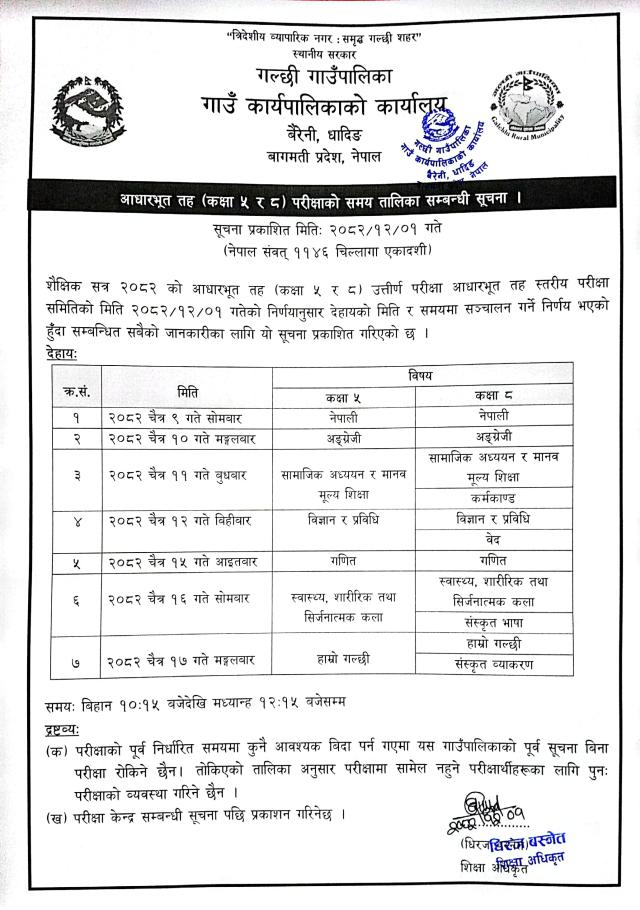 आधारभूत तह (कक्षा ५ र ८) परीक्षाको समय तालिका सम्बन्धी सूचना ।