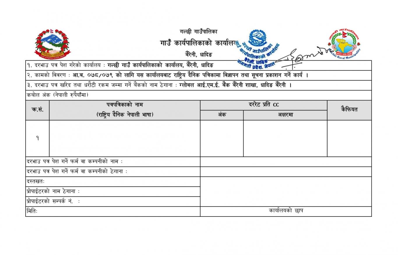आ.ब. ०७८/०७९ को लागि विज्ञापन र सूचना प्रकाशनको लागि दरभाउ पत्र आह्वानको सूचना ।