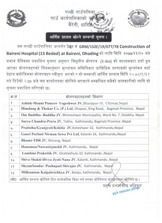आर्थिक प्रस्ताव खोल्ने सम्बन्धी सूचना । ठेक्का नं. GRM/NCB/1S2E/19/077/78