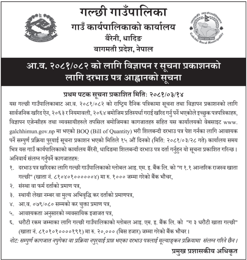 आ.व. २०८१/०८२ को लागि विज्ञापन र सूचना प्रकाशनको लागि दरभाउ पत्र आह्वानको सूचना ।
