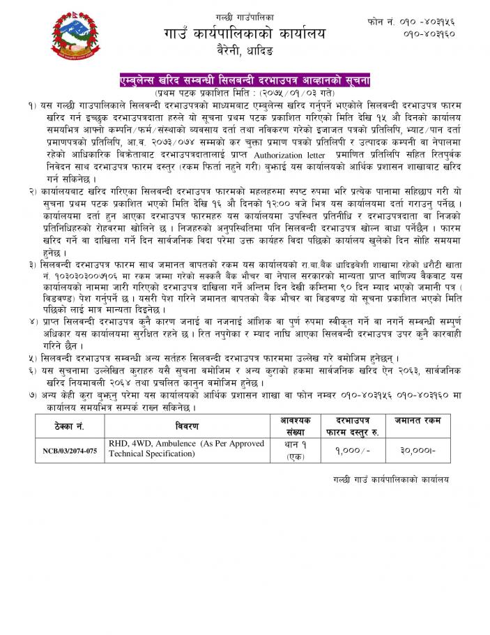 यस गल्छी गाउपालिकाले सिलवन्दी दरभाउपत्रको माध्यमबाट एम्बुलेन्स खरिद गर्नुपर्ने भएकोले सिलवन्दी दरभाउपत्र फारम खरिद गर्न इच्छुक दरभाउपत्रदाता हरुले यो सूचना प्रथम पटक प्रकाशित गरिएको मिति देखि १५ औ दिनको कार्यालय समयभित्र आफ्नो कम्पनि फर्म /संस्थाको ब्यवसाय दर्ता तथा नविकरण गरेको इजाजत पत्रको प्रतिलिपि, भ्याट/पान दर्ता प्रमाणपत्रको प्रतिलिपि, आ.व. २०७३/०७४ सम्मको कर चुक्ता प्रमाण पत्रको प्रतिलिपी र उत्पादक कम्पनी वा नेपालमा रहेको आधिकारिक बिक्रेताबाट दरभाउपत्रदातालाई प्राप्त Authorization letter प्रमाणित प्रतिलिपि सहित रितपुर्वक निवेदन साथ दरभाउपत्र फारम दस्तुर (रकम फिर्ता नहुने गरी) बुझाई यस कार्यालयको आर्थिक प्रशासन शाखाबाट खरिद गर्न सकिनेछ ।