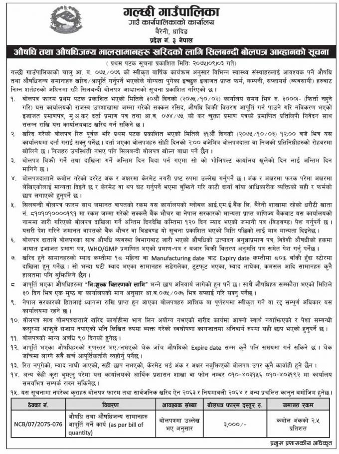 औषधी तथा औषधीजन्य मालसामानहरु खरिदको लागि सिलबन्दी बोलपत्र आह्वानको सूचना