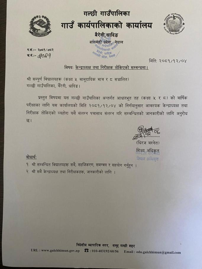 केन्द्राध्यक्ष तथा निरिक्षक तोकिएको सम्बन्धमा।