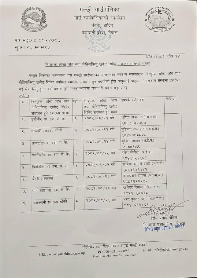 निःशुल्क आँखा जाँच तथा मोतियाबिन्दु छनोट शिविर सञ्चालन सम्बन्धी सुचना ।