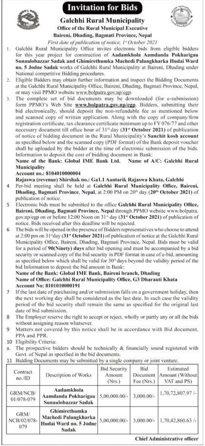 बोलपत्र आह्वानको सूचना । (ठेक्का नं. GRM/NCB/01/078-079 र GRM/NCB/02/078-079)