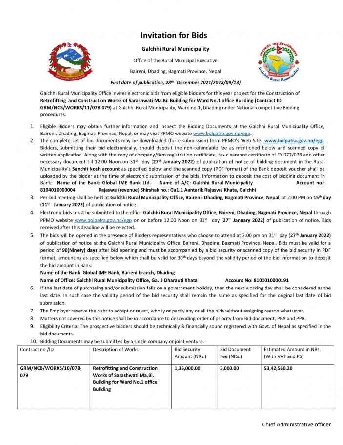 बोलपत्र आह्वानको सूचना । (ठेक्का नं. GRM/NCB/WORKS/11/078-079)
