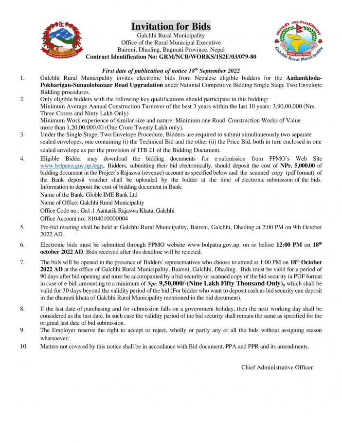 बोलपत्र आह्वानको सूचना । (ठेक्का नं. GRM/NCB/WORKS/1S2E/03/079-80)