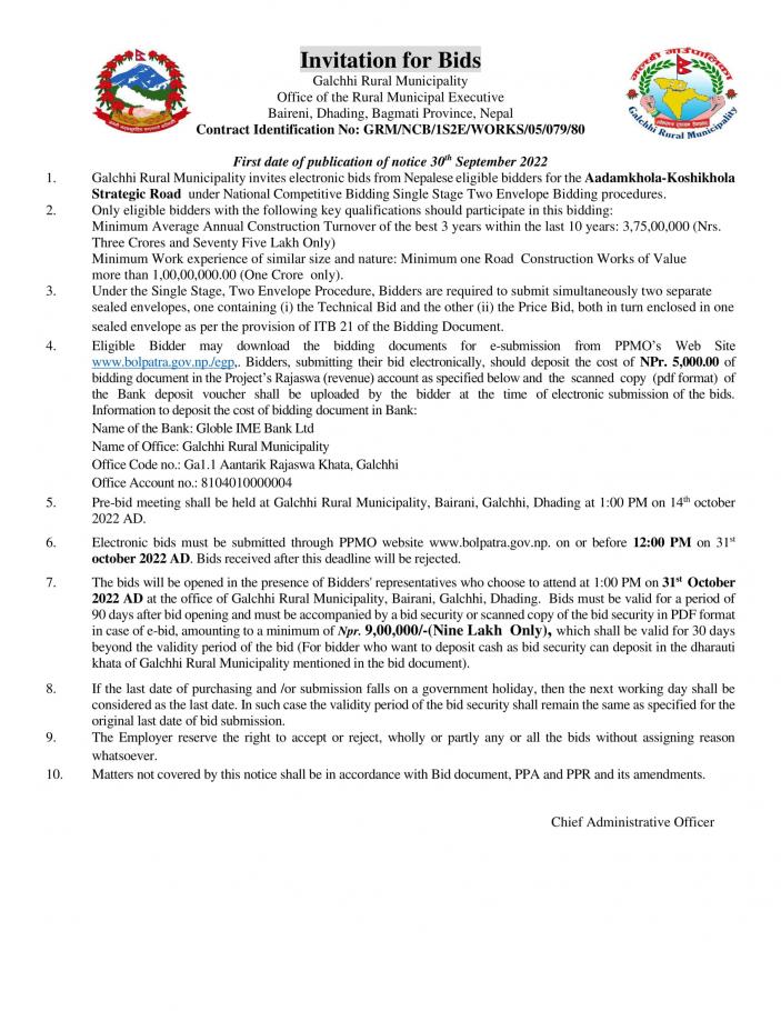 बोलपत्र आह्वानको सूचना । (ठेक्का नं. GRM/NCB/WORKS/1S2E/05/079-80)