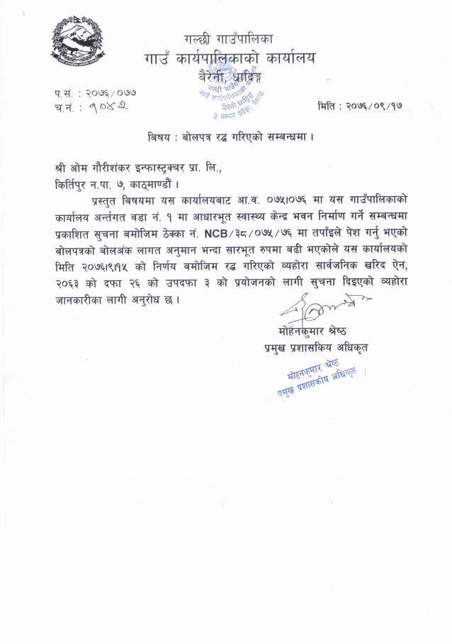 बोलपत्र रद्द गरिएको सम्बन्धि सूचना (ओम गौरीशंकर इन्फ्रास्ट्रक्चर प्रा.लि.)