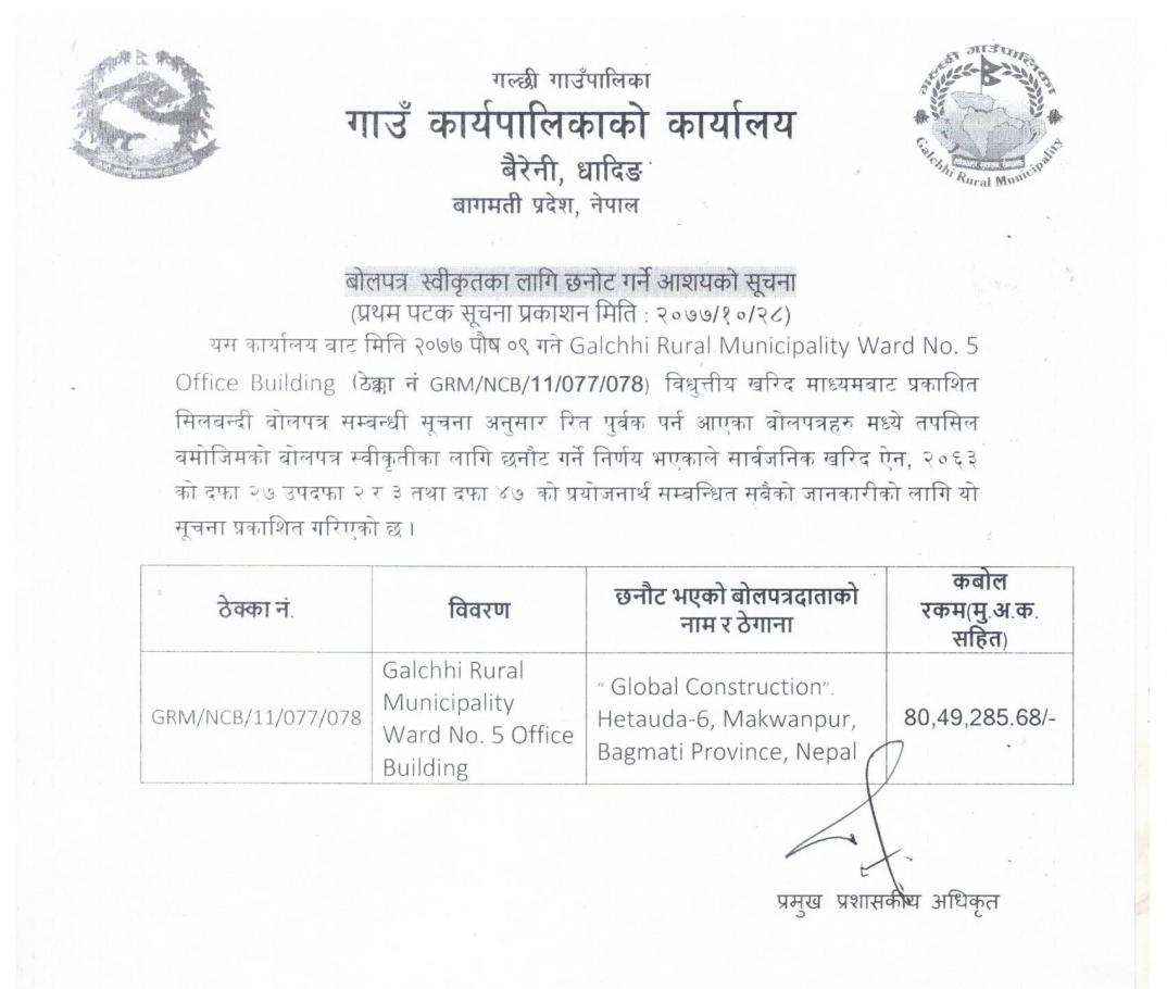 बोलपत्र स्वीकृत गर्ने आशयको सूचना - (ठेक्का नं. GRM/NCB/11/077/078)