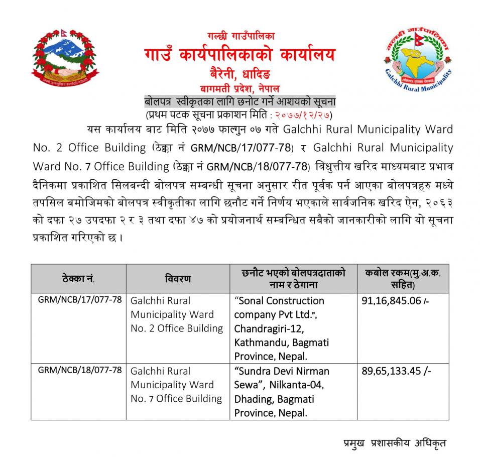 बोलपत्र स्वीकृत गर्ने आशयको सूचना - (ठेक्का नं. GRM/NCB/17/077-78, GRM/NCB/18/077-78)