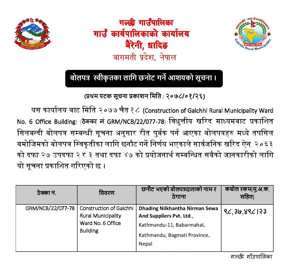 बोलपत्र स्वीकृत गर्ने आशयको सूचना - (ठेक्का नं. GRM/NCB/22/077-78)