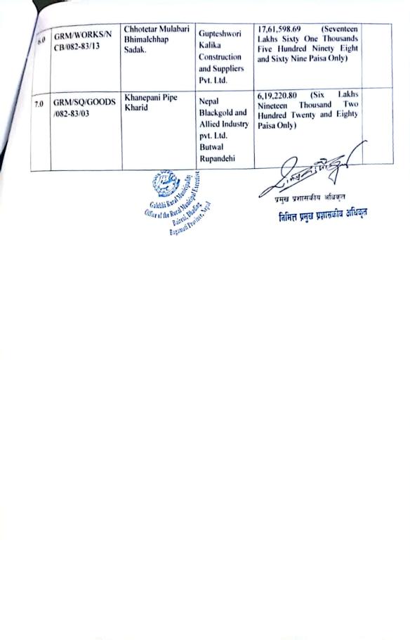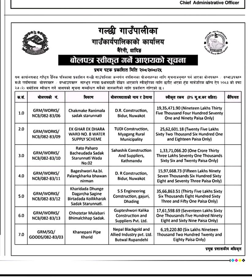 बोलपत्र स्वीकृत गर्ने आशयको सूचना !