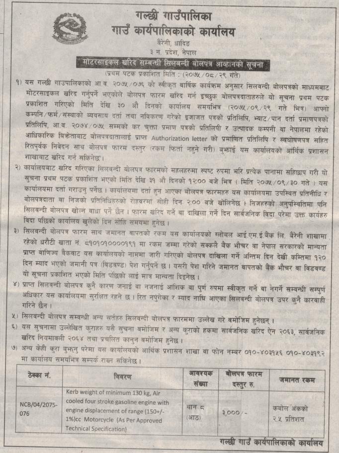 मोटरसाईकल खरिद सम्बन्धि सिलबन्दी बोलपत्र आह्वानको सूचना