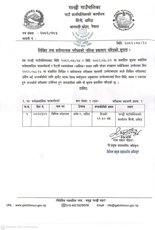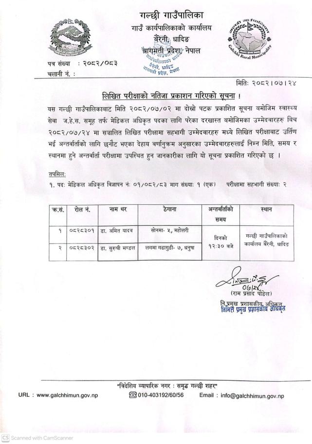 लिखित र प्रयोगात्मक परीक्षाको नतिजा प्रकाशन तथा अन्तर्वार्ता सम्बन्धी सूचना ।