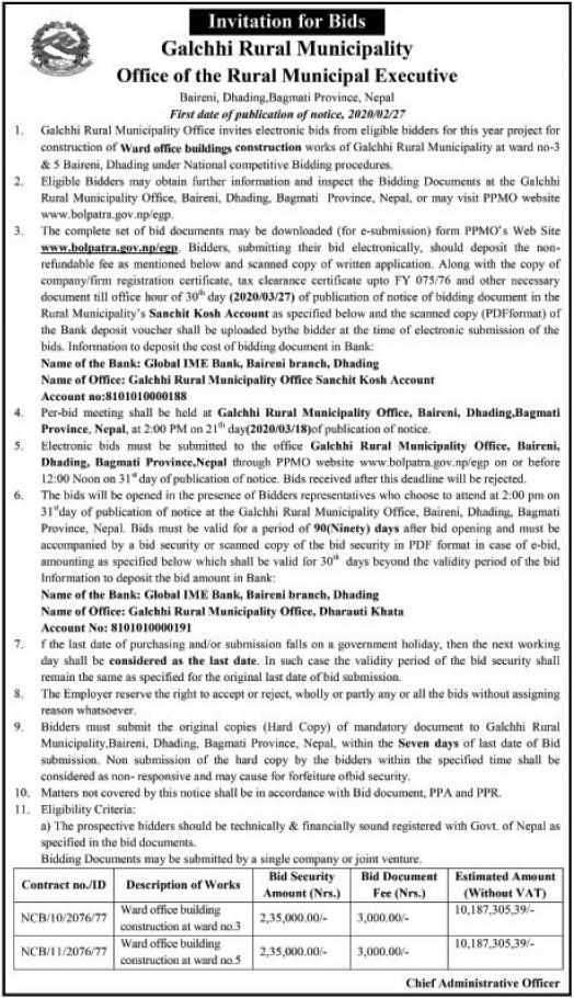 वडा नं. ३ र ५ को वडा कार्यलय भवन निर्माणका लागि  बोलपत्र आह्वान गरिएको सूचना