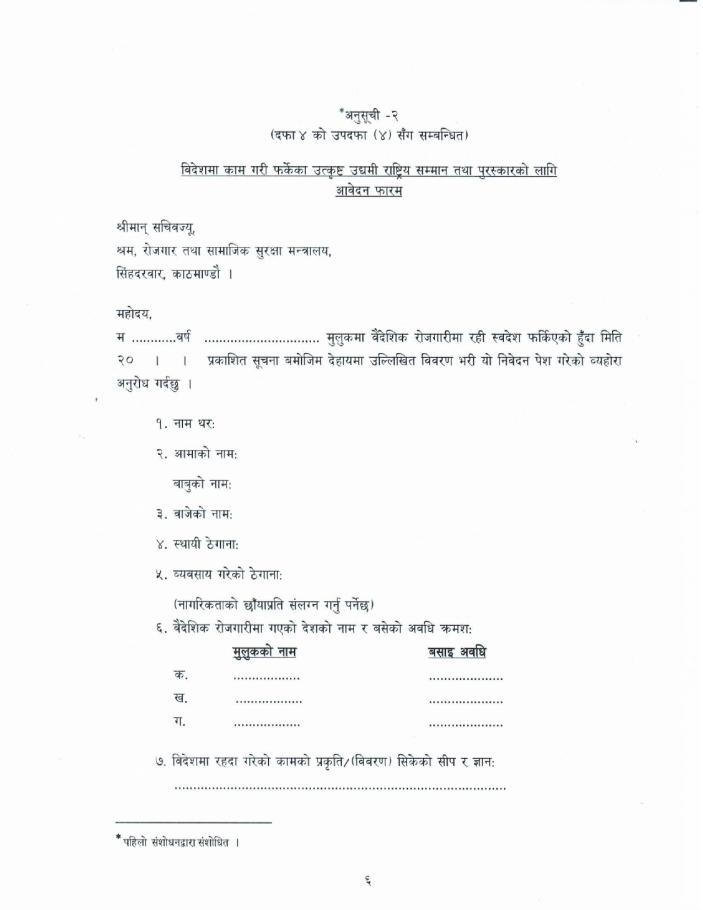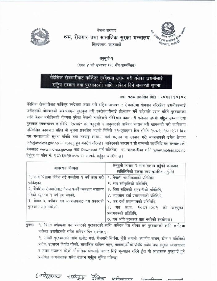 वैदेशिक रोजगारीबाट फर्किएर स्वदेशमा उद्यम गरी बसेका उद्यमीलाई राष्ट्रिय सम्मान तथा पुरस्कारको लागि आवेदन दिने सम्बन्धी सूचना !