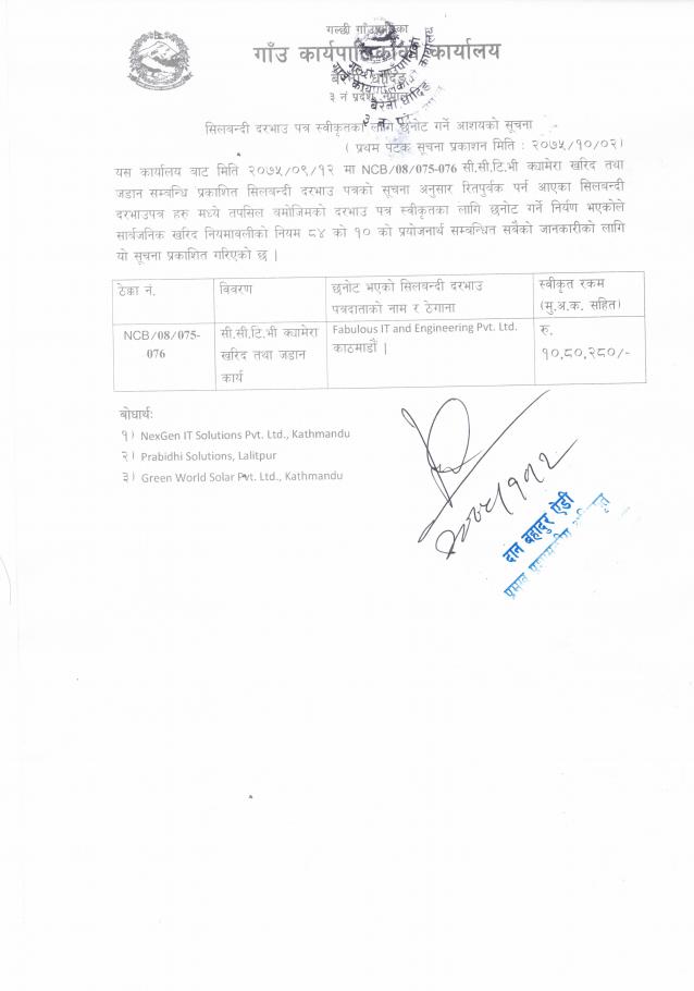 शिलबन्दी दरभाउ पत्र स्वीकृतका लागि छनोट गर्ने आशयको सुचना- CCTV खरिद तथा जडान