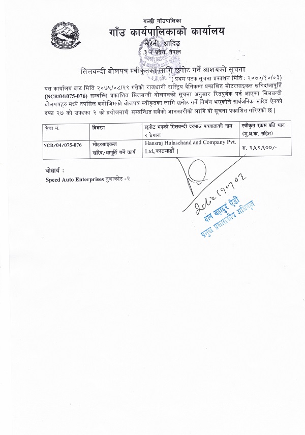 शिलबन्दी बोलपत्र स्वीकृतका लागि छनोट गर्ने आशयको सुचना - मोटरसाइकल