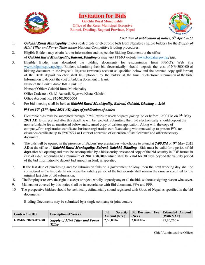 शिलबन्द्दी दरभाउ आह्वानको सूचना -(ठेक्का नं. GRM/NCB/24/077-78)