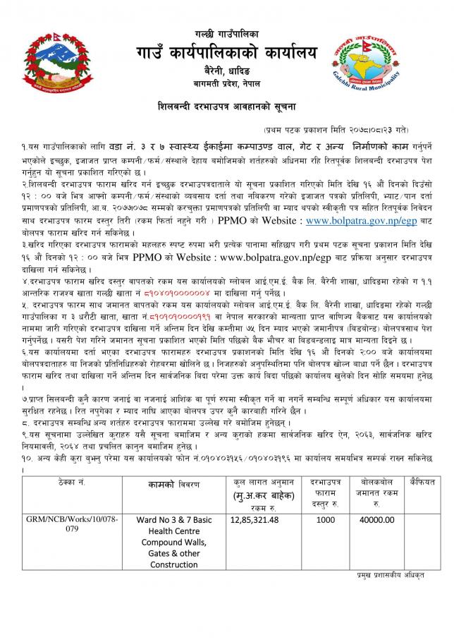 शिलबन्द्दी दरभाउ आह्वानको सूचना । (ठेक्का नं. GRM/NCB/Works/10/078-079)