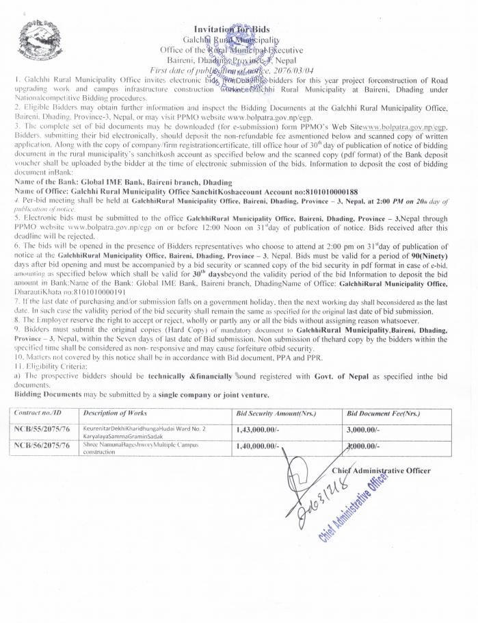 श्री नमुना बागेश्वरी बहुमुखी क्याम्पस र वडा नं. २ ग्रामिण बाटो निर्माण लागि बोलपत्र आह्वान सम्बन्धि सूचना