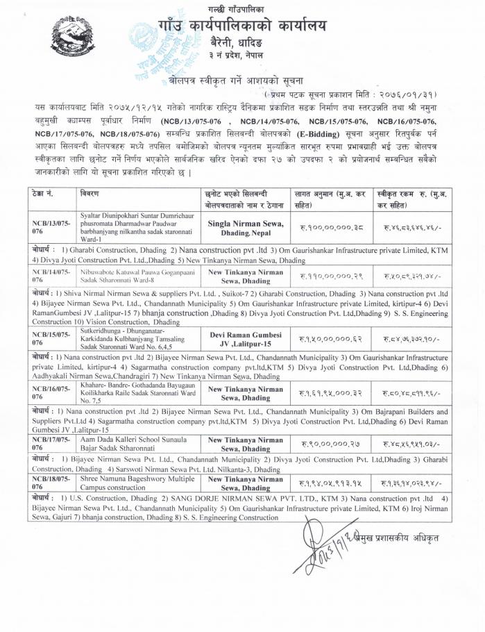 सडक निर्माण तथा स्तरउन्नति तथा श्री नमुना बहुमुखी क्याम्पस पूर्वाधार निर्माणका लागि बोलपत्र स्वीकृत गर्ने आशय पत्र
