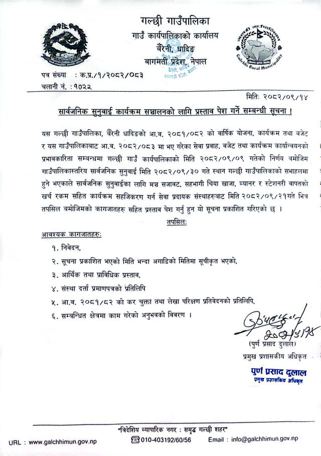 सार्वजनिक सुनुवाई कार्यक्रम सञ्चालनको लागि प्रस्ताव पेश गर्ने सम्बन्धी सूचना !