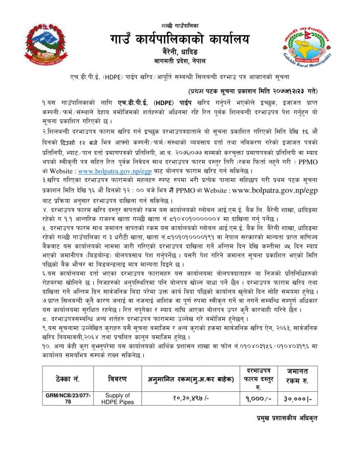 सिलबन्दी दरभाउ पत्र आह्वानको सूचना (ठेक्का नं. GRM/NCB/23/077-78)