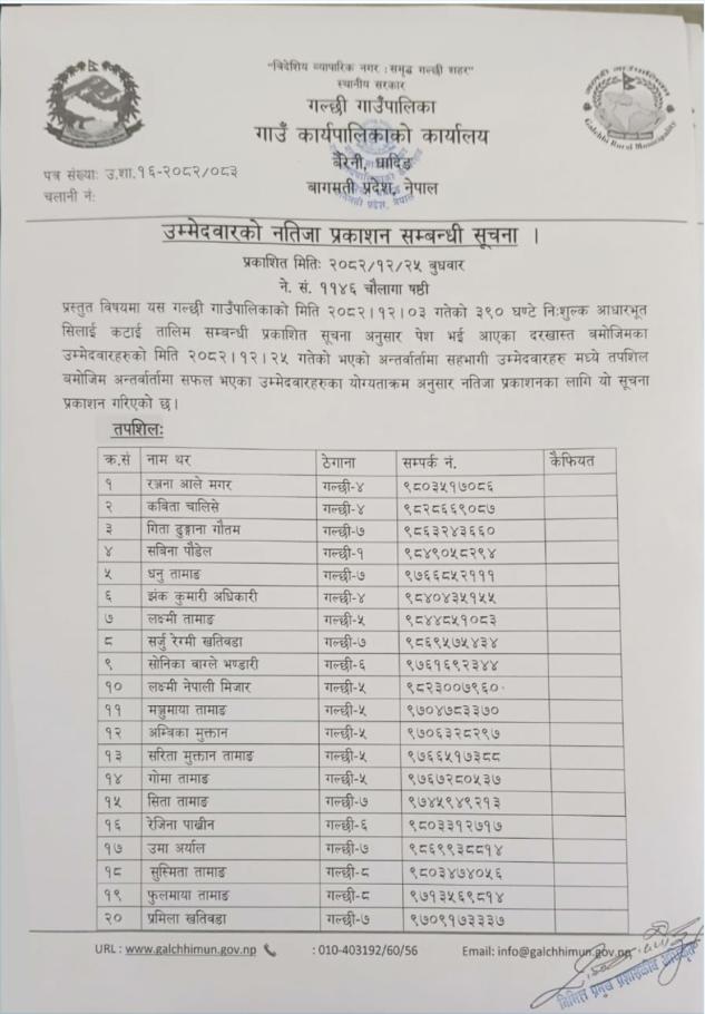 सिलाई कटाई तालिमको अन्तर्वार्तामा सहभागी उम्मेदवारको नतिजा प्रकाशन सम्बन्धी सूचना।