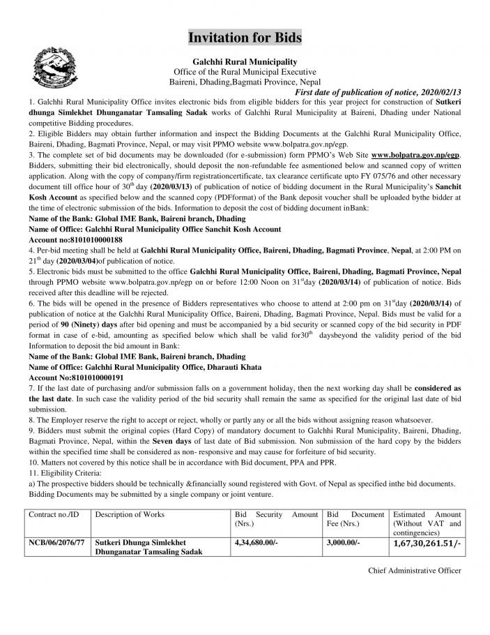 सुत्केरीढुंगा सिम्खेत ढुंगानाटार ताम्सालिङ सडक निर्माण तथा मर्मतको लागि आह्वान गरिएको बोलपत्रको सूचना