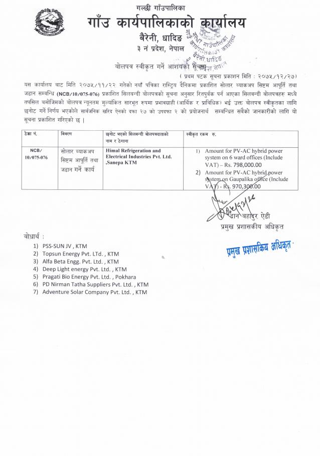 सोलार ब्याकअप सिस्टम (हाईब्रिड) खरिद/जडानको लागि बोलपत्र स्वीकृत गर्ने आशय सुचना