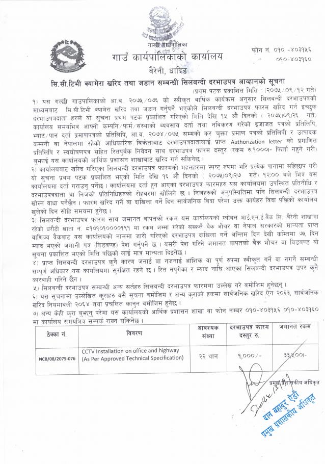 CCTV Camera खरिद तथा जडान सम्बन्धि सिलबन्दी दरभाउपत्र आह्वानको सूचना