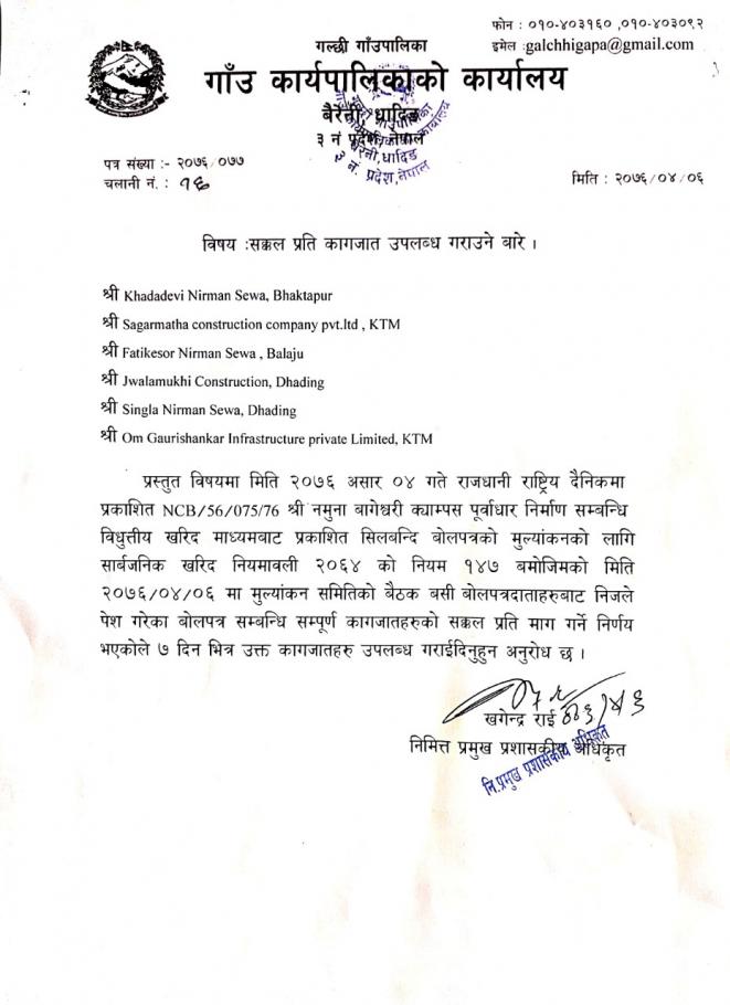 NCB/56/075/76 श्री नमुना बागेश्वरी क्याम्पस पूर्वाधार निर्माण सम्बन्धि बोलपत्रको सक्कल प्रति कागजात उपलब्ध गराउने