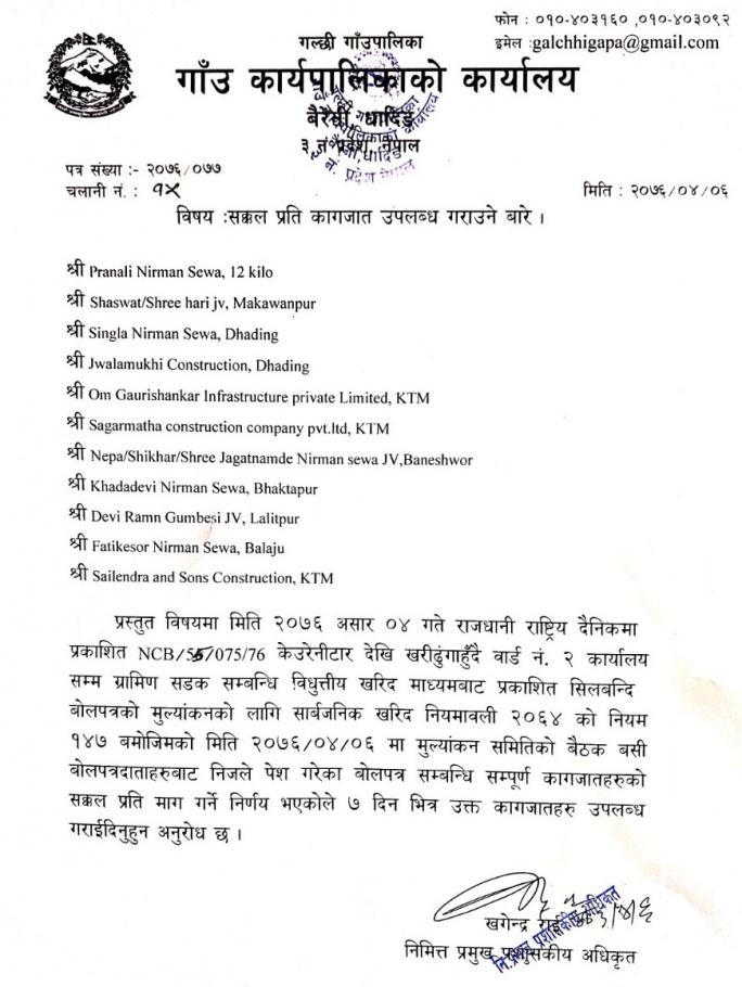 NCB/55/075/76 केउरेनीटार देखि खरीढुंगाहुँदै वार्ड नं. २ कार्यालय सम्म ग्रामिण सडक सम्बन्धि बोलपत्रको सक्कल प्रति कागजात उपलब्ध गराउने